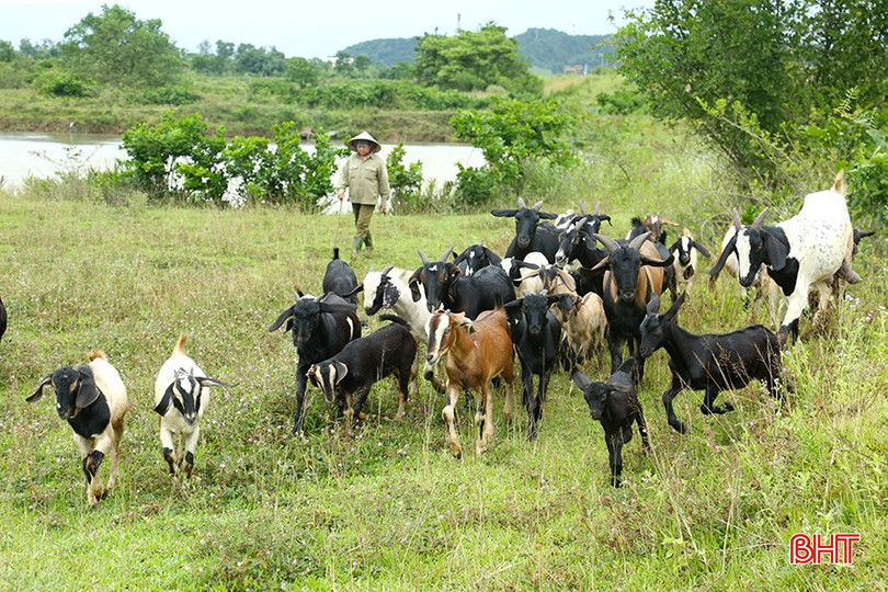 Tận dụng những bãi đất trống phía sau tuyến đê hữu sông Lam, hằng ngày bà Mưu chăn thả đàn dê hàng chục con tự tìm kiếm thức ăn tự nhiên. Nguồn thức ăn ở khu vực này khá dồi dào với nhiều loại cây cỏ mọc hoang.