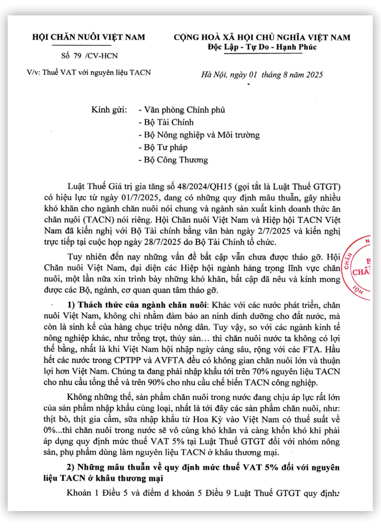 Hội Chăn nuôi Việt Nam cũng nhiều lần kiến nghị, trong đó có văn bản gửi Bộ Tài chính ngày 02/7/2025 và cuộc họp trực tiếp ngày 28/7/2025, nhưng đến nay vấn đề vẫn chưa được xử lý.