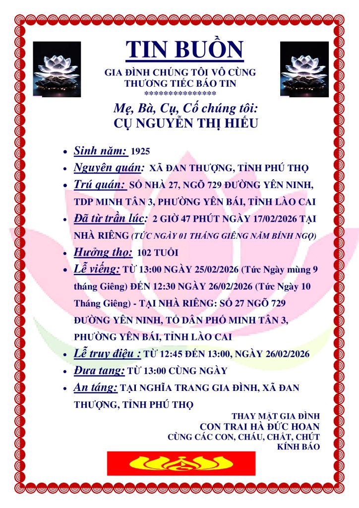 Lễ viếng được tổ chức từ 13 giờ 00 ngày 25 tháng 02 năm 2026 đến 12 giờ 30 ngày 26 tháng 02 năm 2026 tại nhà riêng: Số 27, ngõ 729 đường Yên Ninh, tổ dân phố Minh Tân 3, phường Yên Bái, tỉnh Lào Cai.