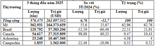 Nhập khẩu đậu tương từ thị trường Canada 3 tháng đầu năm 2025 đạt 54.617 tấn, tương đương 27,32 triệu USD, giá 500,1 USD/tấn, chiếm 9,5% trong tổng lượng và chiếm 10,4% tổng kim ngạch nhập khẩu đậu tương của cả nước, tăng mạnh 98,9% về lượng, tăng 60,2% về kim ngạch nhưng giá giảm 19,4% so với 3 tháng đầu năm 2024.