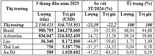 Thị trường lớn thứ 2 là Brazil, 3 tháng đầu năm 2025 đạt 129.792 tấn, tương đương 57,38 triệu USD, giá 442,1 USD/tấn, chiếm 22,5% trong tổng lượng và chiếm 21,9% trong tổng kim ngạch nhập khẩu đậu tương của cả nước, giảm mạnh 52,6% về lượng, giảm 60,5% về kim ngạch và giá giảm 16,6% so với 3 tháng đầu năm 2024.