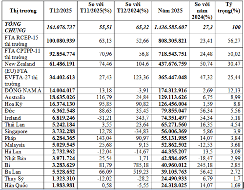 Newzealand, Mỹ, Australia, Ireland và Đức là các thị trường chủ yếu cung cấp sữa và sản phẩm cho Việt Nam; trong đó nhập khẩu nhiều nhất từ Newzealand đạt 437,68 triệu USD, chiếm 30,5% trong tổng kim ngạch nhập khẩu nhập khẩu nhóm hàng này của cả nước, tăng mạnh 50,7% so với năm 2024; riêng tháng 12/2025 đạt 61,49 triệu USD, tăng 74,5% so với tháng 11/2025 và tăng 104,6% so với tháng 12/2024.