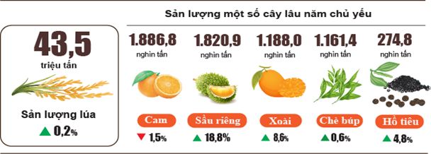 Theo Cục Thống kê (Bộ Tài chính), sản lượng lúa trong năm 2025 đạt 43,54 triệu tấn, cao nhất trong vòng 4 năm qua. Giá trị sản phẩm cây lâu năm tăng 5,54% so với năm 2024 do sản lượng cây ăn quả đạt khá, cây công nghiệp lâu năm phục hồi tích cực. Chăn nuôi gia cầm tăng 5,9% nhờ các mô hình chăn nuôi liên kết theo chuỗi được mở rộng.