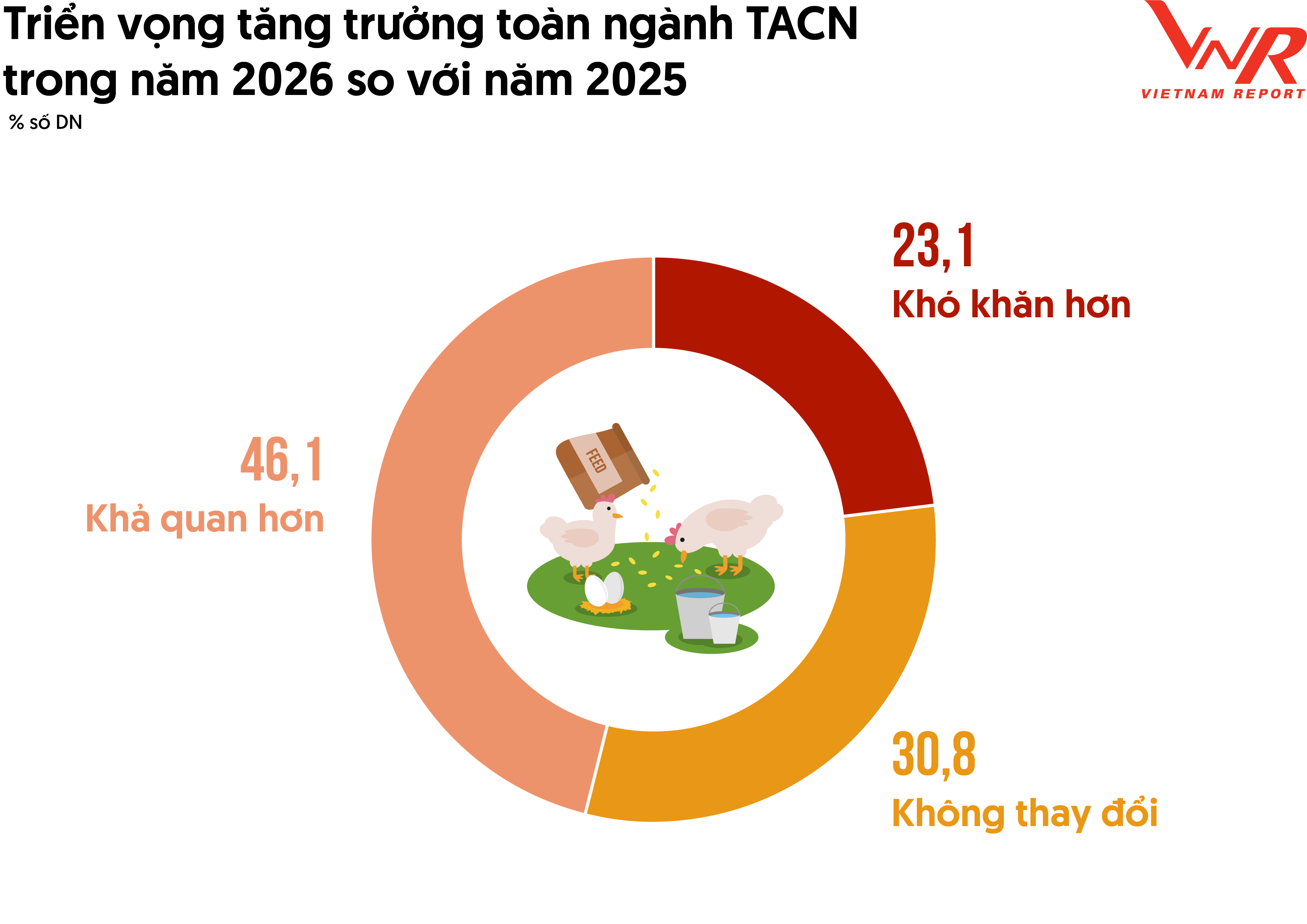 Trong bối cảnh năm 2025 được xem là giai đoạn “hồi phục có chọn lọc” sau những cú kéo dài từ dịch bệnh và biến động thị trường, tâm lý doanh nghiệp ngành TACN đã chuyển dịch theo hướng lạc quan thận trọng. Khảo sát của Vietnam Report cho thấy 46,1% doanh nghiệp tin rằng triển vọng ngành năm 2026 sẽ khả quan hơn; 30,8% dự báo ngành duy trì ổn định; và 23,1% cho rằng môi trường kinh doanh sẽ khó khăn hơn.