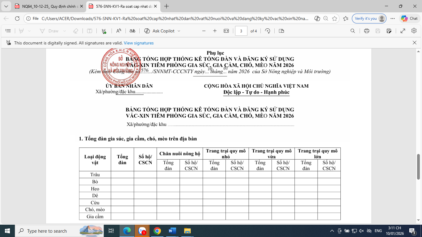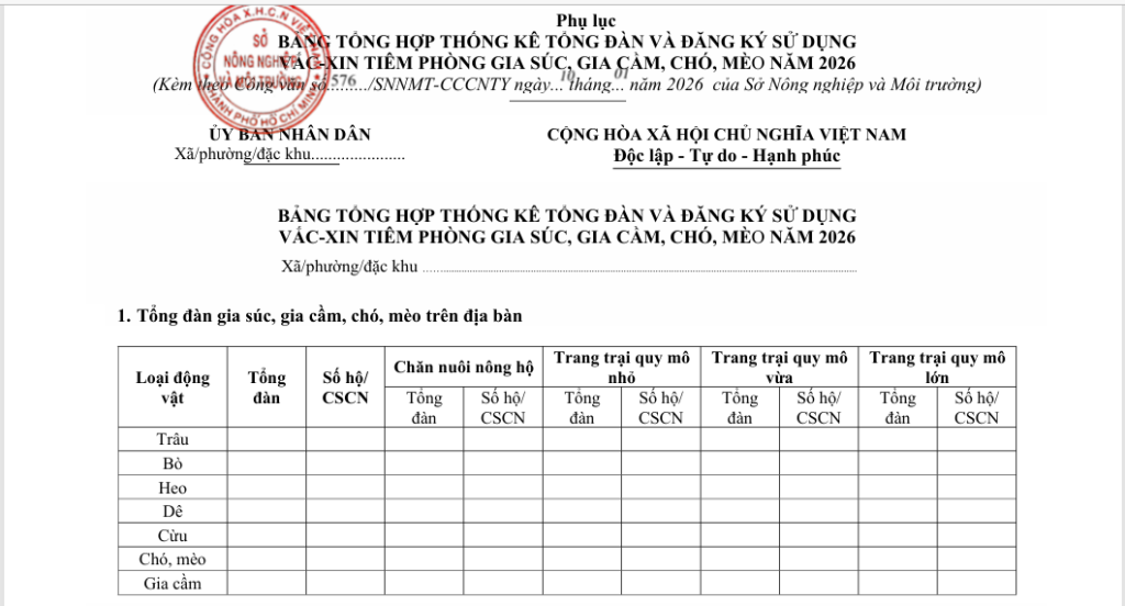 Sở Nông nghiệp và Môi trường Thành phố Hồ Chí Minh đề nghị Ủy ban nhân dân các xã, phường và đặc khu Côn Đảo nhanh chóng rà soát, thống kê tổng đàn gia súc, gia cầm và chó, mèo hiện có tại các địa phương gửi về Chi cục Chăn nuôi và Thú y. Thời gian thực hiện đến hết ngày 23/01/2026.