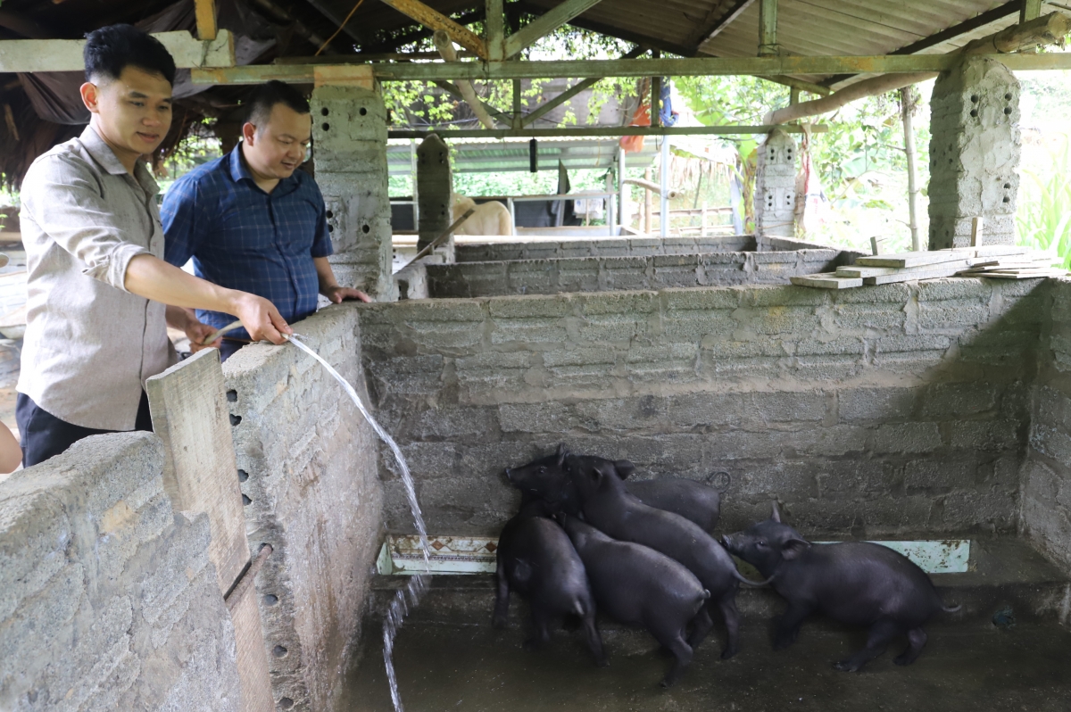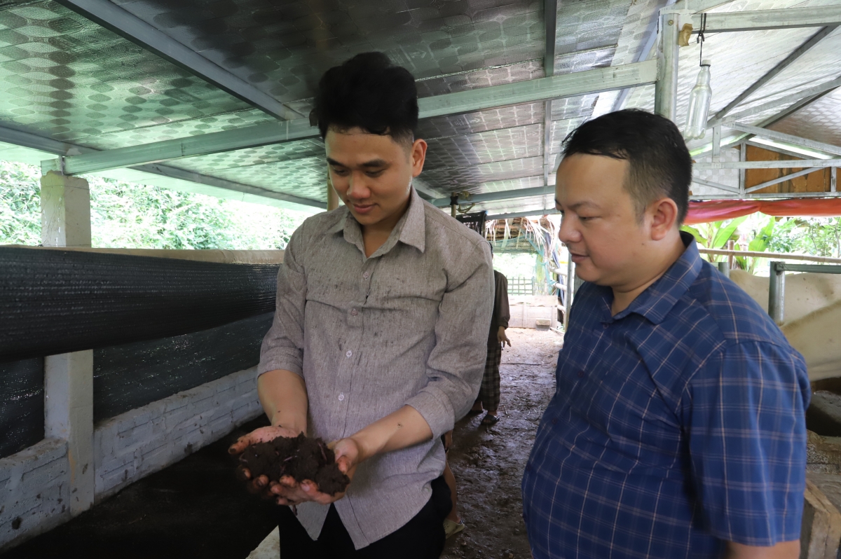 Anh Thành chia sẻ kinh nghiệm nuôi giun quế và lợn đen thương phẩm với lãnh đạo xã Kim Ngọc