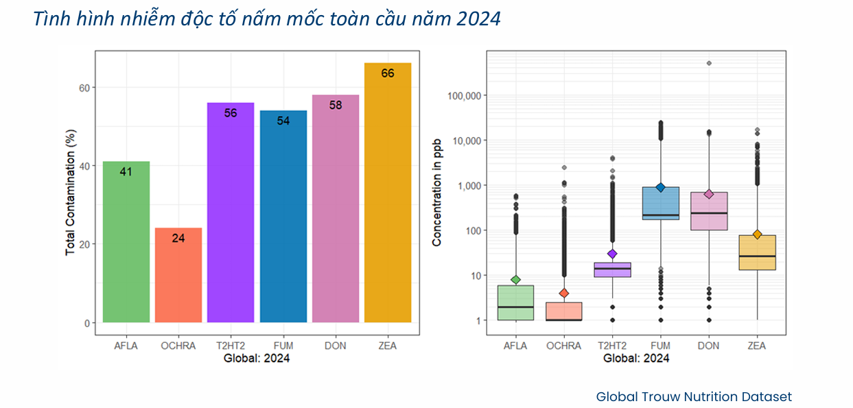 Theo các nghiên cứu quốc tế, hầu hết nguyên liệu sản xuất thức ăn và thức ăn thành phẩm và mẫu chất thải của vật nuôi đều nhiễm độc tố nấm mốc ở mức độ khác nhau. Tình trạng này ngày càng gia tăng do việc canh tác, biến đổi khí hậu, chất lượng nguyên liệu và quá trình vận chuyển xuyên quốc gia, lưu trữ không phù hợp.