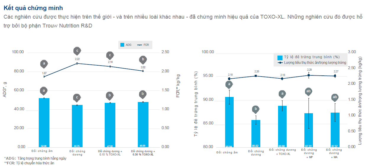 TOXO®-XL giúp giảm độc tố nấm mốc nhờ khả năng hấp thụ và liên kết các phân tử độc tố trong đường tiêu hóa, ngăn chúng đi vào máu và được thải ra ngoài, đồng thời nâng cao năng suất vật nuôi. Thực tế cho thấy, sản phẩm giúp cải thiện tỷ lệ ăn vào ADG, tỷ lệ đẻ và hiệu quả chuyển hóa thức ăn FCR. Hợp chất giúp bảo vệ sức khỏe đường ruột vật nuôi ngay cả khi nguồn cám bị nhiễm độc tố.