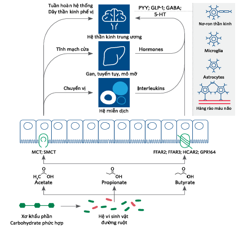 Các axit béo mạch ngắn (short-chain fatty acids – SCFAs) có vai trò mấu chốt trong quá trình truyền tín hiệu từ hệ vi sinh vật đến não, vì SCFAs là chất chuyển hóa chính được tạo ra bởi hệ vi sinh vật đường ruột thông qua quá trình lên men chất xơ và tinh bột, trong đó phổ biến nhất là acetate, propionate và butyrate.