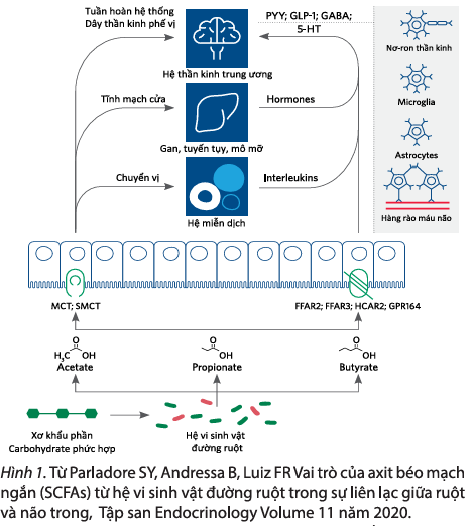 Các axit béo mạch ngắn (short-chain fatty acids – SCFAs) có vai trò mấu chốt trong quá trình truyền tín hiệu từ hệ vi sinh vật đến não, vì SCFAs là chất chuyển hóa chính được tạo ra bởi hệ vi sinh vật đường ruột thông qua quá trình lên men chất xơ và tinh bột, trong đó phổ biến nhất là acetate, propionate và butyrate.