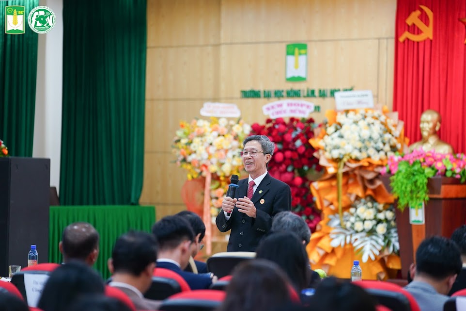 GS.TS. Lê Đình Phùng – Bí thư Đảng ủy, Chủ tịch Hội đồng Trường ĐH Nông Lâm – Đại học Huế phát biểu. Ảnh: HUAF