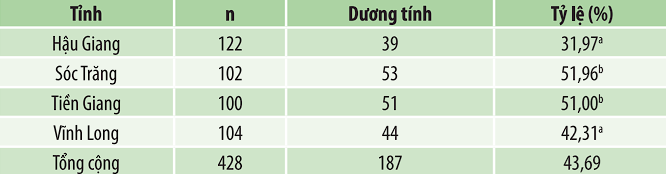 Kết quả về sự hiện diện của Salmonella spp. trên vịt từ các hộ chăn nuôi 4 tỉnh được trình bày ở bảng 2 cho thấy, trong tổng số 428 mẫu Salmonella spp. hiện diện 187 mẫu (43,69%). Tỉnh Sóc Trăng có cao nhất (51,96%; 53/102 mẫu) và Hậu Giang thấp nhất (31,97%; 39/122 mẫu) với sự khác biệt có ý nghĩa thống kê giữa các tỉnh (P <0,05). Điều này phản ánh sự phân bố không đồng đều của Salmonella spp. trong các tỉnh. Trong các nghiên cứu trước đây tại khu cực Đồng bằng sông Cửu Long, Tran và ctv (2004) phân lập được Salmonella spp. từ 7,1% tổng số mẫu ở lợn, gà và vịt. Tương tự, Tu và ctv (2015) ghi nhận tỷ lệ nhiễm rất cao ở các trang trại gà (64,7%), vịt (94,3%) và lợn (91,3%). Sự khác biệt giữa các nghiên cứu và giữa các tỉnh có thể do điều kiệnchăn nuôi, vệ sinh chuồng trại, mật độ đàn, mùa vụ và hiệu quả kiểm soát dịch bệnh. Theo EFSA (2019), mật độ nuôi cao và stress đàn làm tăng nguy cơ nhiễm Salmonella; trong khi Hoàng Thị Anh Phương và Lương Đoàn Minh Châu (2022) cũng cho thấy tỷ lệ nhiễm ở vịt có thể chịu ảnh hưởng bởi yếu tố mùa vụ.