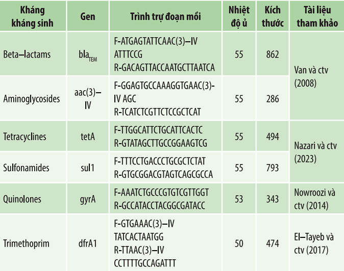 Khả năng đề kháng kháng sinh của các chủng Salmonella spp. được đánh giá thông qua sự hiện diện của một số gen KKS phổ biến tại khu vực ĐBSCL. Các mẫu DNA dương tính với cặp mồi định danh S. enteritidis và S. pullorum (SPS4_00301–SPS4_00311 và CitE2) được sử dụng để khảo sát các gen đề kháng, với trình tự mồi được trình bày ở bảng 1.