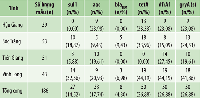 Kết quả cho thấy Salmonella spp. hiện diện trong 187/428 mẫu (43,7%), với tỷ lệ cao nhất tại Sóc Trăng (52,0%) và thấp nhất tại Hậu Giang (32,0%) (P<0,05). Trong số 186 mẫu dương tính, các gen kháng thuốc phổ biến nhất là gyrA, dfrA1 và tetA (26,9%), tiếp đến là aac(3)–IV (17,7%), sul1 (14,5%) và blaTEM (4,3%).