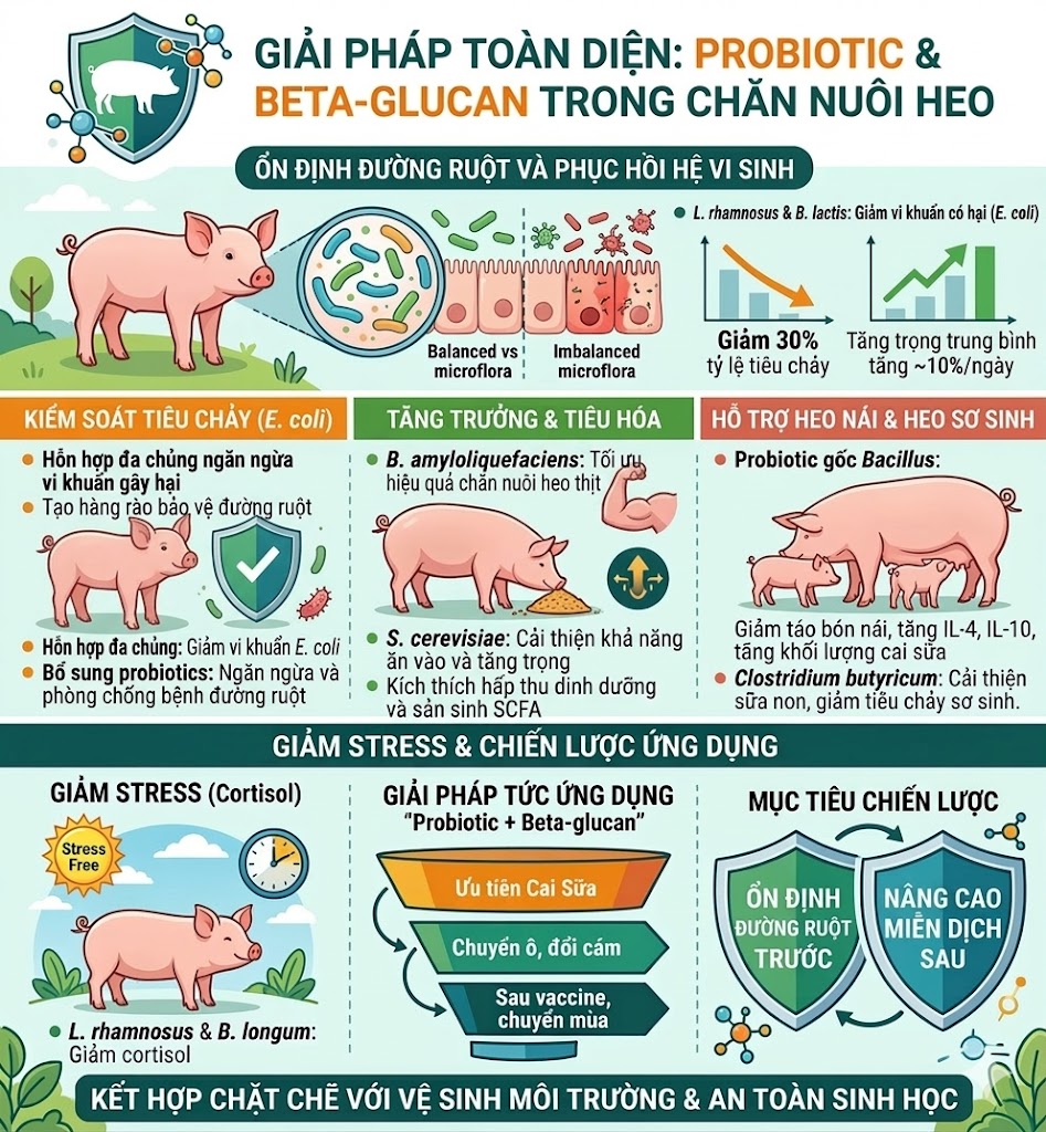 Trong bối cảnh áp lực kháng sinh tăng, môi trường chăn nuôi bị ô nhiễm, dịch bệnh phức tạp, rủi ro cao, ngành chăn nuôi đang dịch chuyển từ cách tiếp cận “xử lý bệnh bằng kháng sinh” sang chiến lược phòng bệnh chủ động bằng dinh dưỡng và quản trị hệ vi sinh. Nổi bật trong nhóm giải pháp sinh học là Probiotic (lợi khuẩn + nấm men Saccharomyces), đặc biệt Beta-glucan nhằm tăng cường miễn dịch.
