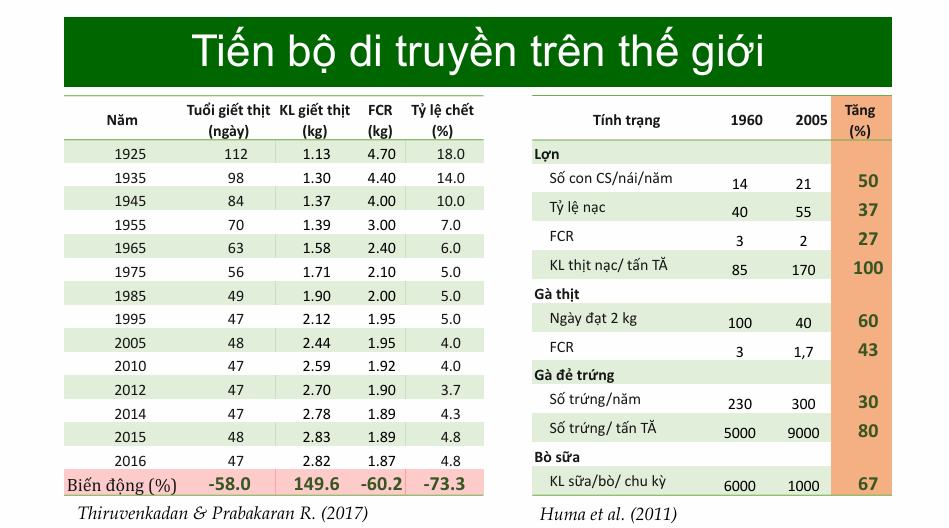 Theo PGS.TS Đỗ Đức Lực, giai đoạn từ 1960 đến 2005, tiến bộ di truyền về năng suất vật nuôi trên thế giới đã đạt được những bước phát triển vượt bậc đối với các vật nuôi chính. Mức tiến bộ di truyền phụ thuộc vào các yếu tố như cường độ chọn lọc, độ chính xác chọn lọc, đa dạng di truyền và khoảng cách thế hệ.