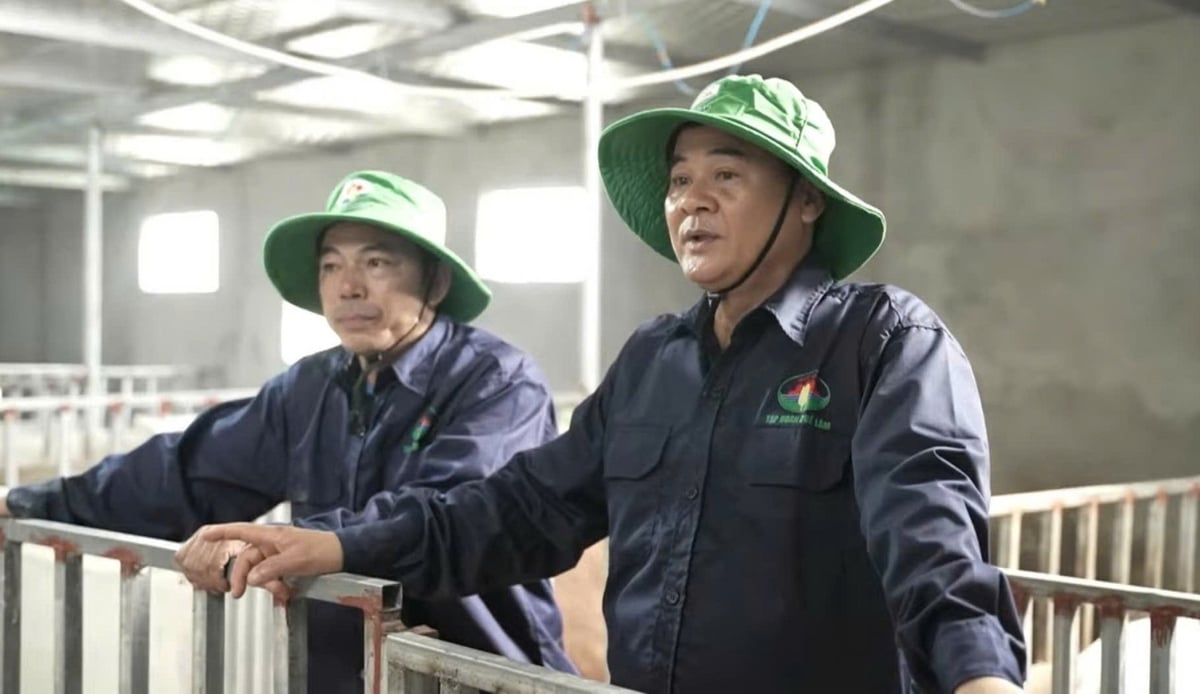 Mô hình liên kết Tập đoàn Quế Lâm chăn nuôi lợn hữu cơ của ông Trần Văn Sơn (bên trái), xã Đan Hải đang an toàn trước dịch tả lợn Châu Phi. Ảnh: Thanh Nga