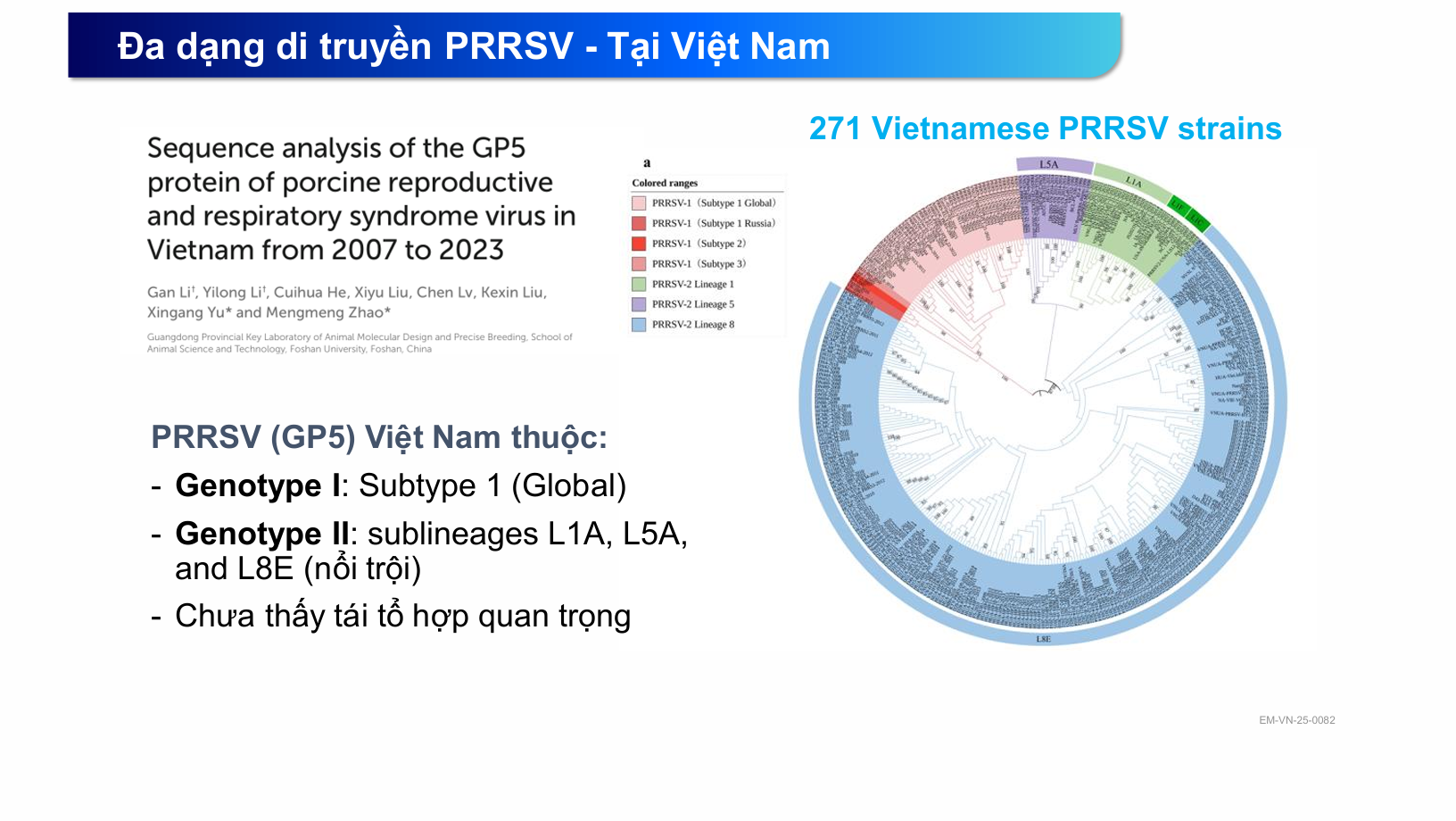 Tại Việt Nam, theo các tác giả GanLi, Yilonng Li, Cuihua He khảo sát từ năm 2007 đến năm 2023 cho biết, phân tích giải trình tự protein GP5 PRRSV tại Việt Nam cho thấy PRRSV thuộc Genotype I: Subtype 1 (Global); Genotype II: sublineages L1A, L5A, và L8E (nổi trội) và chưa thấy tái tổ hợp quan trọng.