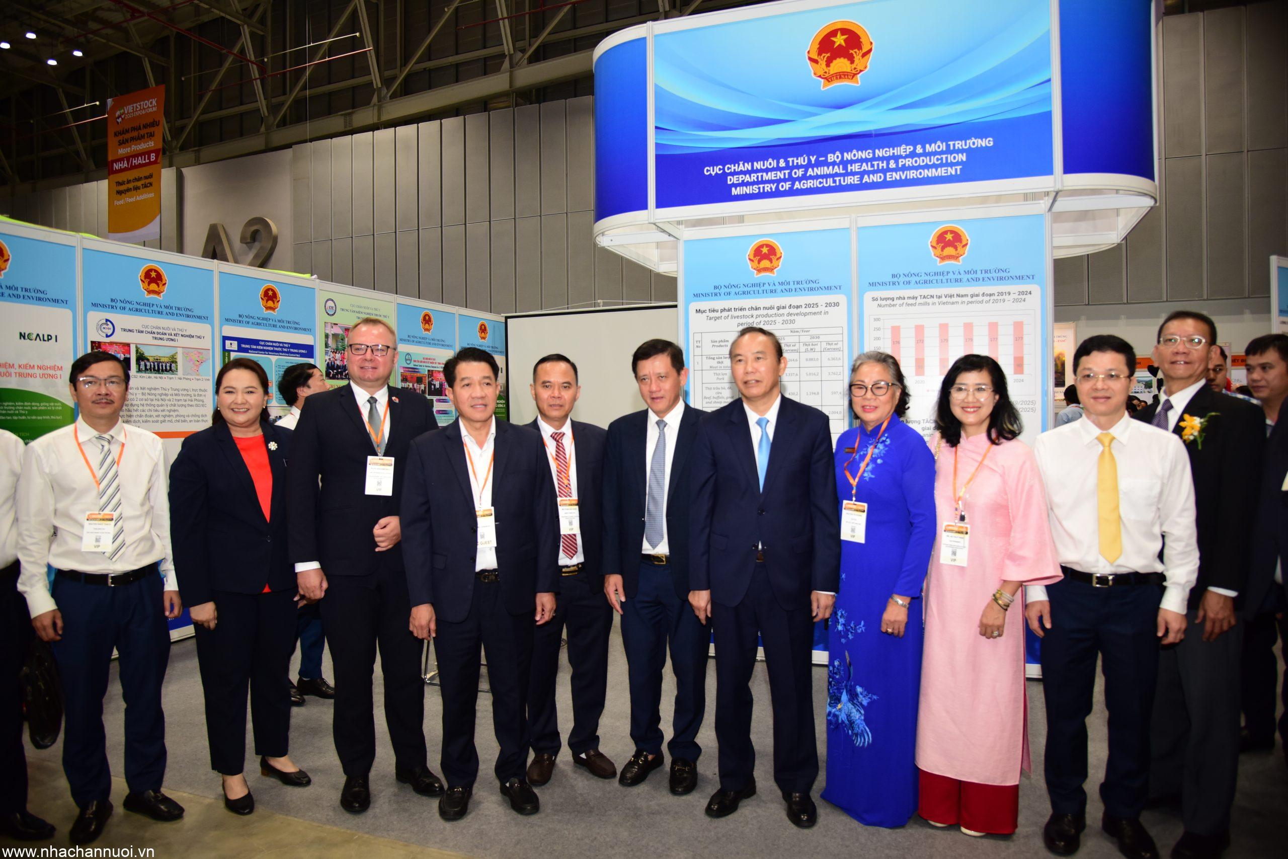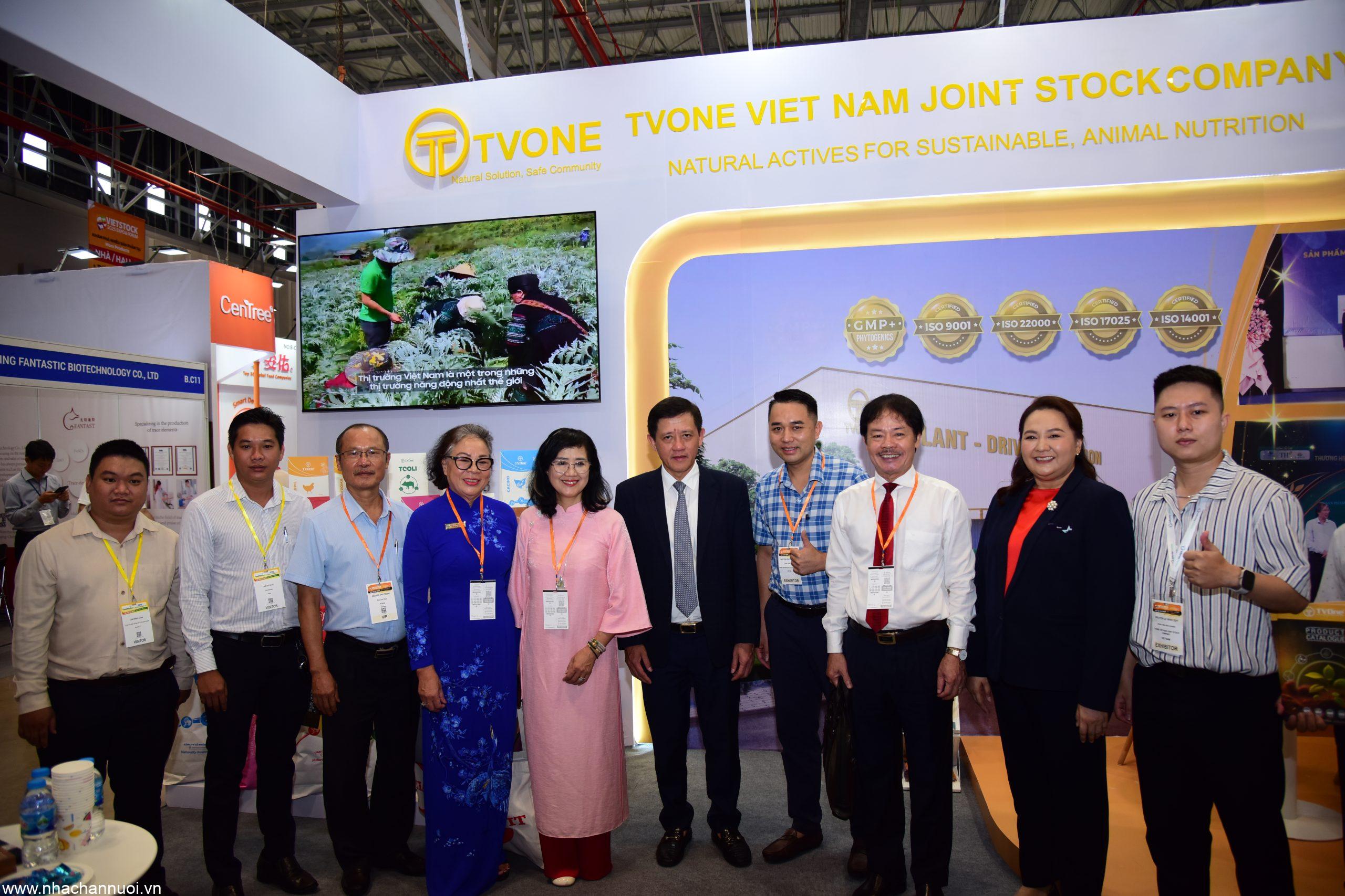 Lãnh đạo Cục Chăn nuôi và Thú y chụp ảnh tại gian hàng của Công ty Cổ phần TVONE Việt Nam – một doanh nghiệp tiên phong tại Việt Nam nghiên cứu, sản xuất phụ gia thức ăn chăn nuôi từ thảo dược.