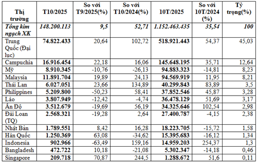 Đứng thứ 2 về kim ngạch là thị trường Campuchia chiếm tỷ trọng 12,6%, đạt gần 145,65 triệu USD, tăng 35,7% so với cùng kỳ năm 2024; riêng tháng 10/2025 xuất khẩu sang thị trường này đạt 16,92 triệu USD, tăng 22,2% so với tháng 9/2025 và tăng 16% so với tháng 10/2024.