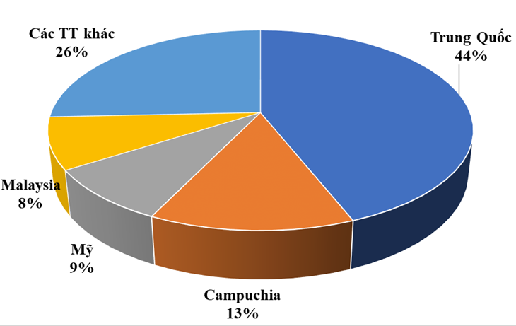 Đứng thứ 2 về kim ngạch là thị trường Campuchia chiếm tỷ trọng 13,2%, đạt trên 114,89 triệu USD, tăng 43,9% so với cùng kỳ năm 2024; riêng tháng 8/2025 xuất khẩu sang thị trường này đạt 19,02 triệu USD, tăng 11,4% so với tháng 7/2025 và tăng mạnh 41,5% so với tháng 8/2024.