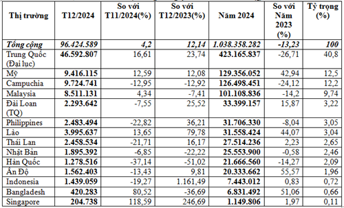 Riêng tháng 12/2024 xuất khẩu đạt trên 96,42 triệu USD, tăng 4,2% so với tháng 11/2024 và tăng 12,1% so với tháng 12/2023.